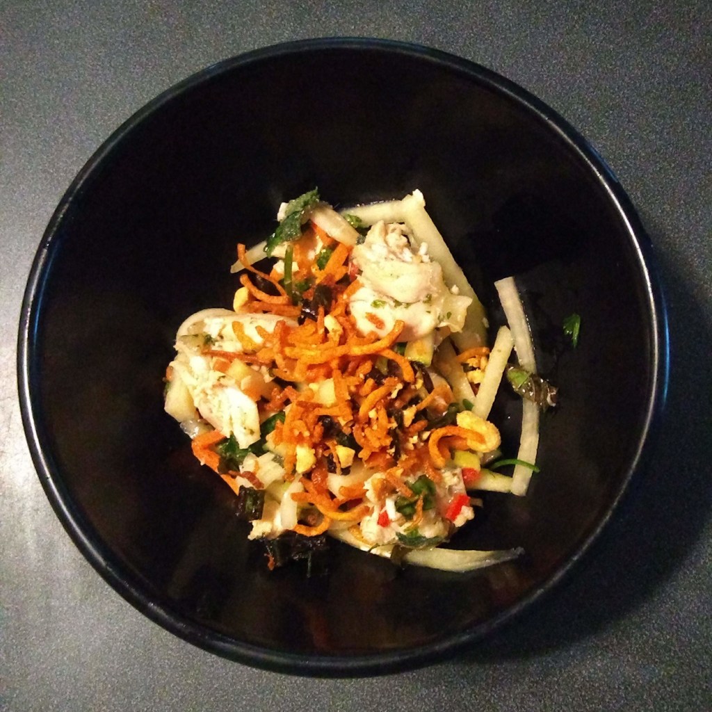 Pig and Khao go all out and top the salad with crisp fried taro and scallions, using the scallion oil in the dressing. I tried fried julienned sweet potatoes, which are sweet like taro, and it was delicious but I don’t have time to do that for lunch.