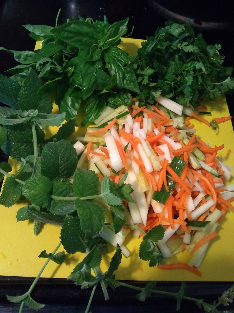 A large handful of each: mint leaves, basil leaves, cilantro, all chopped.