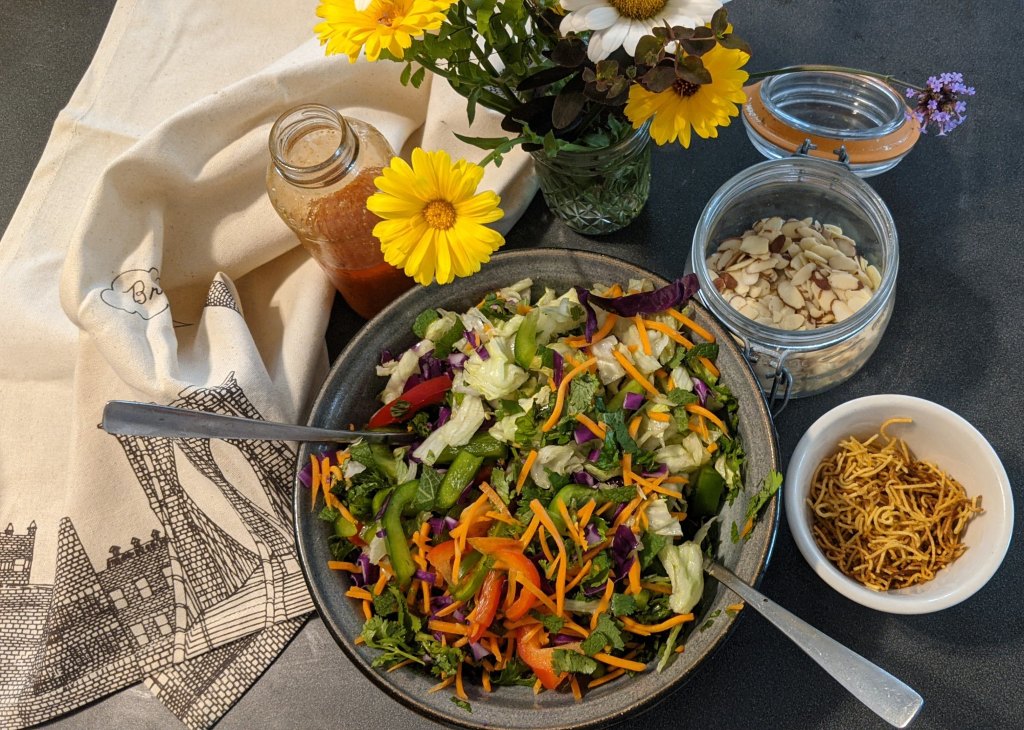This is a great salad. For two months out of the year we have a very hot house so we eat salads and everyone from Louisiana knows that spices can cool you down. I love this salad.