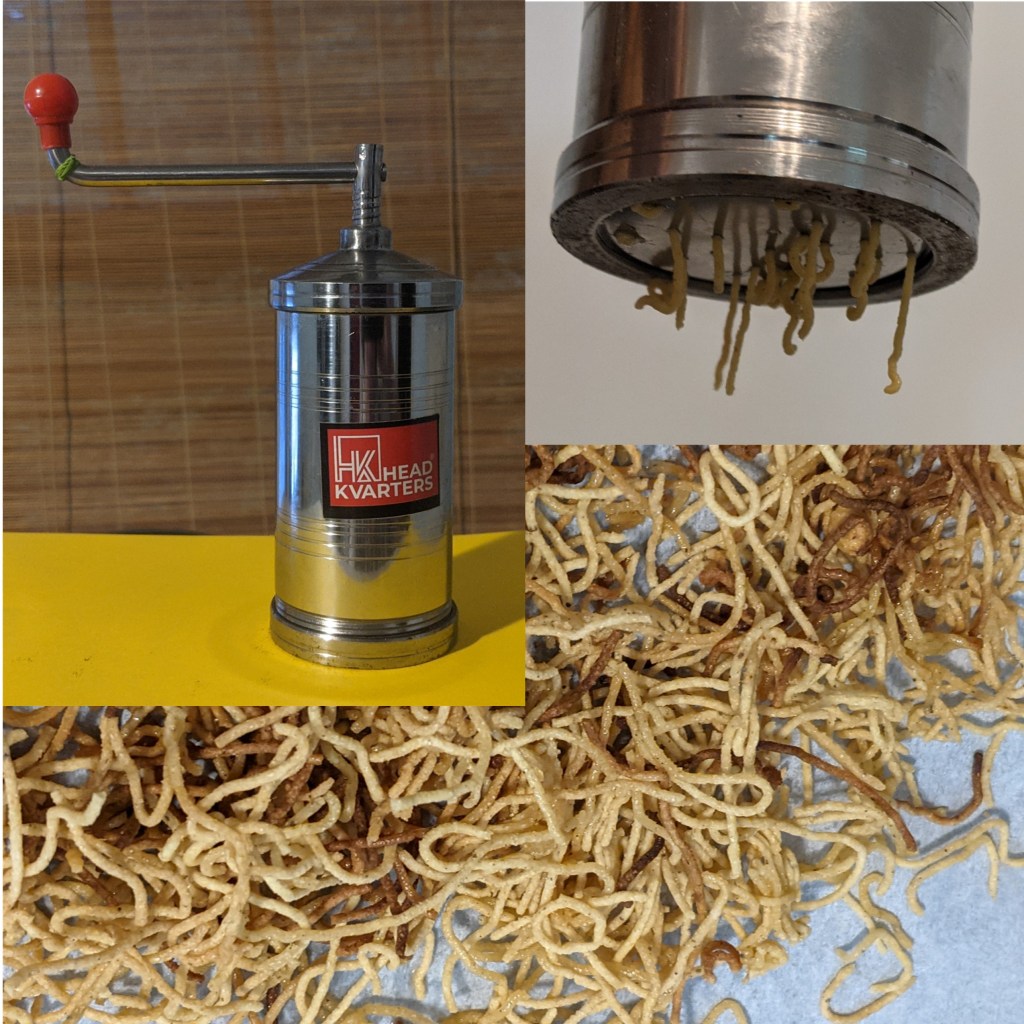 Now for the (optionaI) fun part. I found a beautiful little sev press to make the ultra thin chickpea flour pasta which, fried, sends so many Indian street food dishes into the stratosphere. It is suprisingly easy while at the same time making you feel oddly accomplished. Go figure. The mind is a tricky beast.